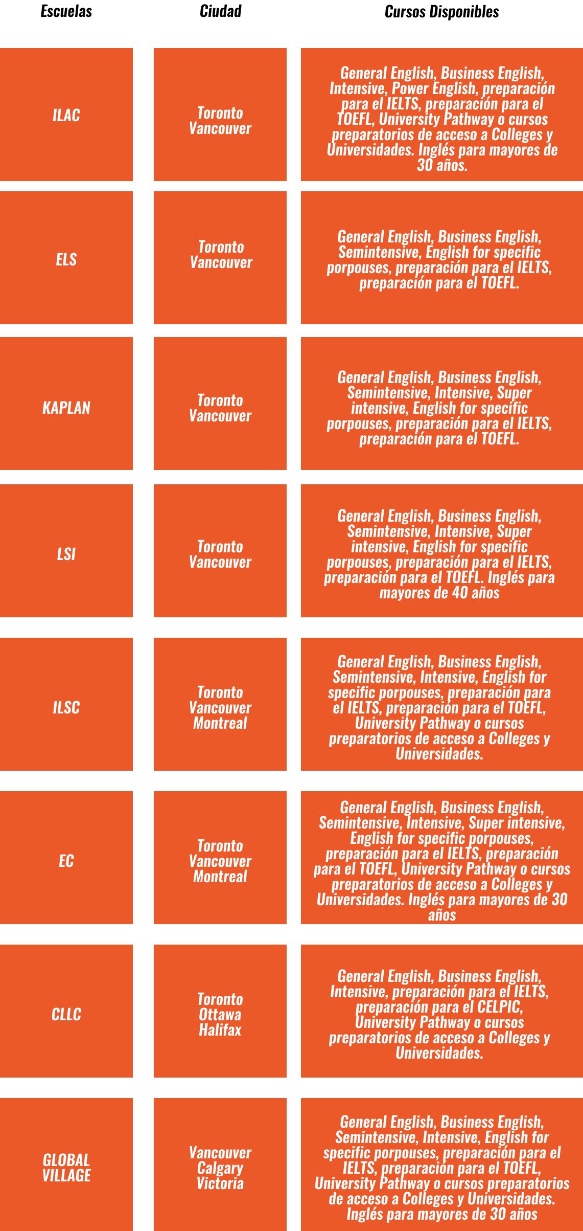 Niveles Disponibles: Los cursos de inglés en Canadá están disponibles para todos los niveles, principiantes, intermedios y avanzados. Los cursos inician generalmente los lunes, consultar las posibles restricciones en fechas de inicio una vez definida la escuela de idiomas