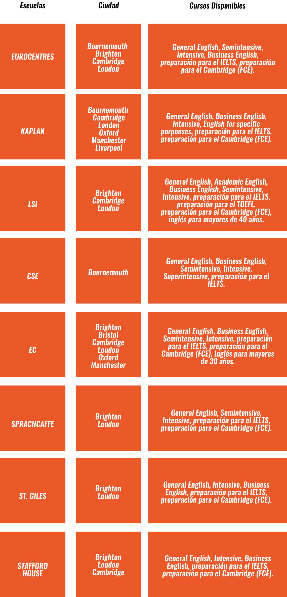 Algunas de las escuelas de idiomas, ciudades y cursos de inglés disponibles en Inglaterra.
