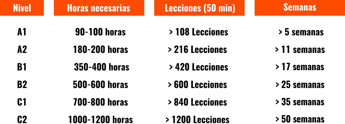 Siguiendo un patrón de mínimo 20 horas de clase por semana en la siguiente tabla se muestran el número de horas necesarias para progresar a un nivel requerido teniendo un nivel mínimo de inglés, establecido por el CEFR (Common European Framework of References for languages).